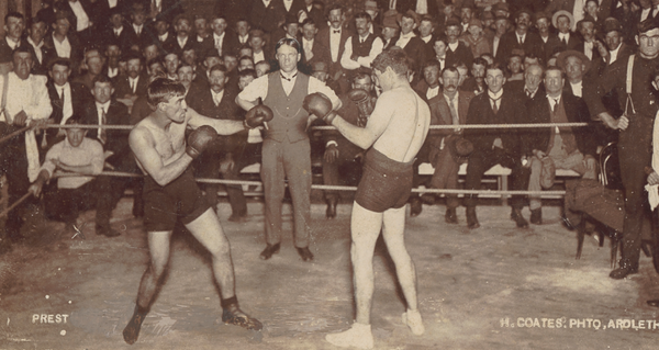 These traveling boxing tents invited local men to challenge their boxers for a prize, often resulting in a practical boxing lesson for the challenger. The troupe's leader would invite showgoers to "throw on a glove" and challenge one of his boxers or wrestlers for a prize of "a round or two for a pound or two".