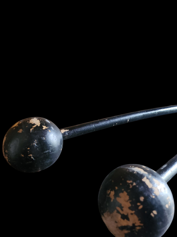 Pair of ebonised wooden early 1900's circus clown barrels. Nice patina, not heavy we're faux strongman barrels used in clown act. Both approx 130 cm'ers long.